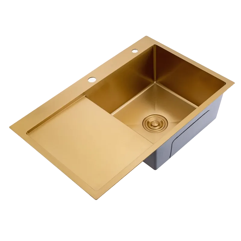 Кухонная мойка Splenka S704.7850.03, золотой сатин. Размер - 780*500*220мм. Кухонные мойки Splenka отличаются практичностью и современным дизайном. Прямоугольные и квадратные раковины для кухни из нержавейки станут идеальным решением для любой кухни. Нержавеющая врезная мойка - отличный выбор для тех, кто ценит качество и долговечность. Изготовлена из качественной нержавеющей стали, которая не боится ни бытовой химии, ни царапин. Металлическая раковина для кухни добавит вашей кухне современности и функциональности. Удобный универсальный монтаж на ваш выбор: врезным способом, поверх столешницы или подстольный. Комплектующие - сифон с выходом для подключения посудомоечной машины и фильтра для питьевой воды, крепление. Толщина стали: верх - 3 мм / чаша - 0.6 мм