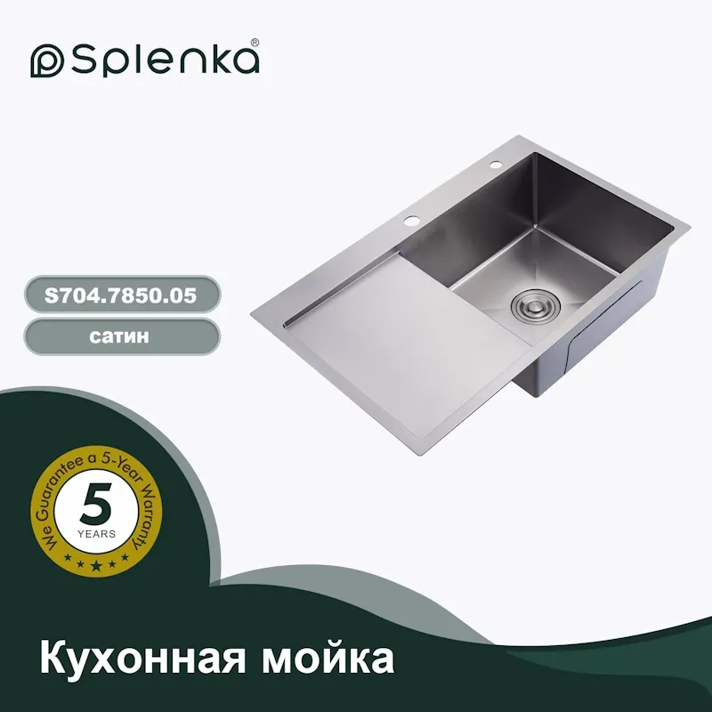Кухонная мойка Splenka S704.7850.05, сатин. Размер - 780*500*220мм. Кухонные мойки Splenka отличаются практичностью и современным дизайном. Прямоугольные и квадратные раковины для кухни из нержавейки станут идеальным решением для любой кухни. Нержавеющая врезная мойка - отличный выбор для тех, кто ценит качество и долговечность. Изготовлена из качественной нержавеющей стали, которая не боится ни бытовой химии, ни царапин. Металлическая раковина для кухни добавит вашей кухне современности и функциональности. Удобный универсальный монтаж на ваш выбор: врезным способом, поверх столешницы или подстольный. Комплектующие - сифон с выходом для подключения посудомоечной машины и фильтра для питьевой воды, крепление. Толщина стали: верх - 3 мм / чаша - 0.6 мм