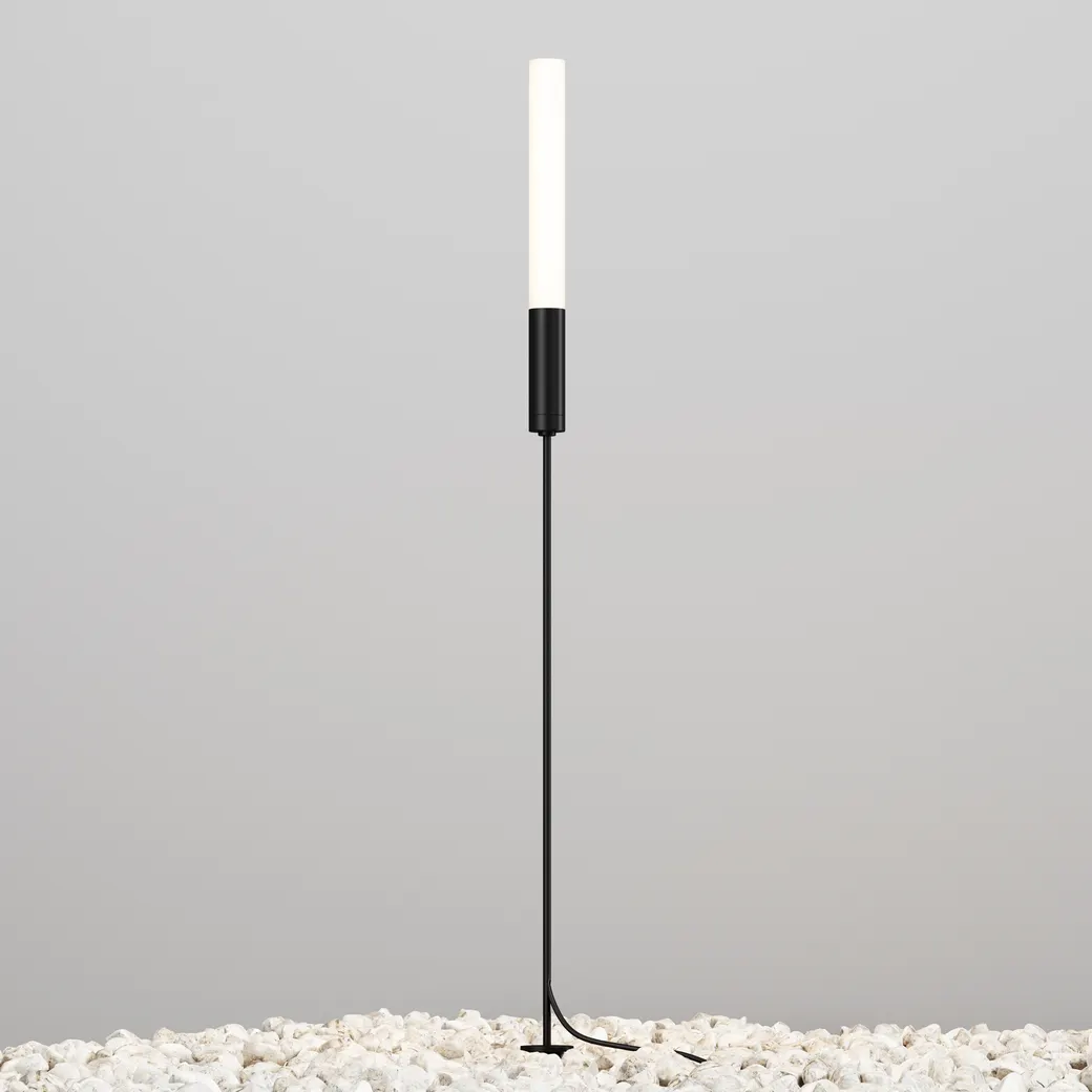 Ландшафтные светильники. Материал — алюминий, цвет — гранит. Дизайн: вытянутая ножка с цилиндрическим плафоном. LED-технология, 3 Вт, теплый свет 3000К. Степень защиты — IP65. Созданы для имитации живого пламени в современном ландшафтном дизайне.