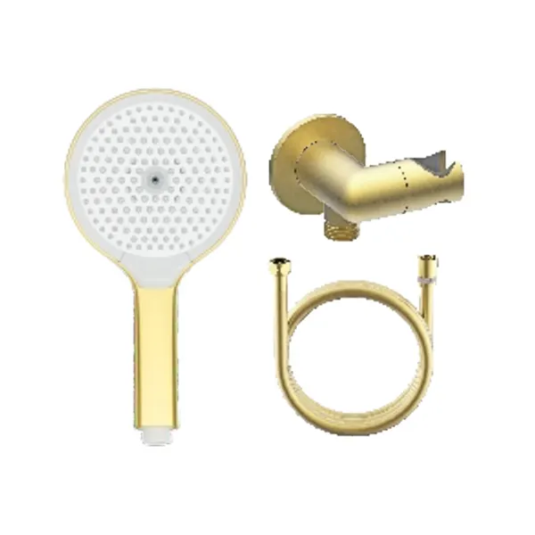 Держатель для душевой лейки с подключением шланга + Набор для душа Артикул : R476.42.03 • Материал - латунь/пластик • Цвет - золотой сатин (матовое золото) • Душевая лейка - 3 режима (пластик/силикон) • Душевой шланг силиконовый 1.5м