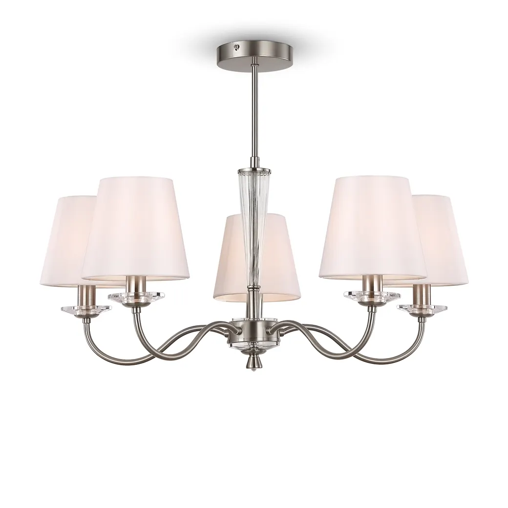 Металлическая арматура в двух оттенках на выбор: латунь и никель. Абажуры – текстиль белого цвета. Декоративные элементы из прозрачного стекла. Источник света – лампа с цоколем E14.