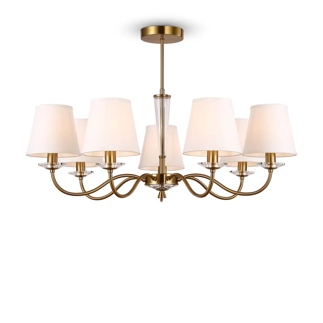 Металлическая арматура в двух оттенках на выбор: латунь и никель. Абажуры – текстиль белого цвета. Декоративные элементы из прозрачного стекла. Источник света – лампа с цоколем E14.