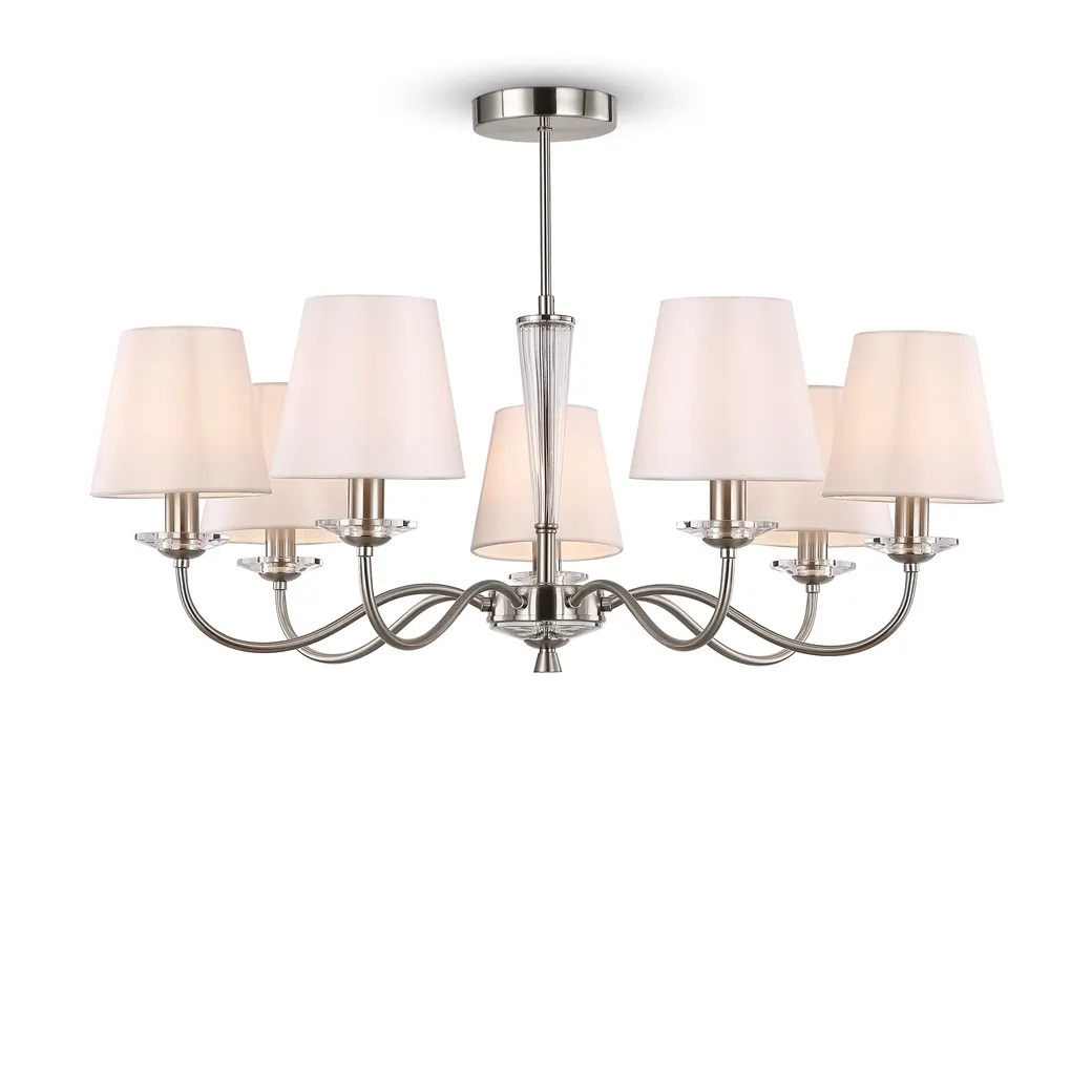 Металлическая арматура в двух оттенках на выбор: латунь и никель. Абажуры – текстиль белого цвета. Декоративные элементы из прозрачного стекла. Источник света – лампа с цоколем E14.
