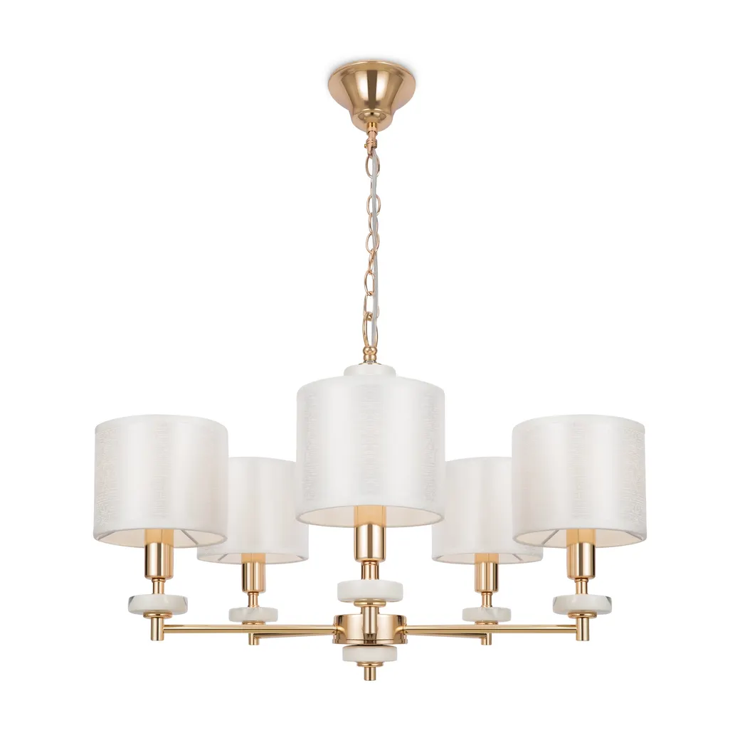 Металлическая арматура золотого оттенка. Абажуры – текстиль на ПВХ кремового цвета. Трендовый керамический декор с имитацией мрамора. Источник света – лампа с цоколем E14.