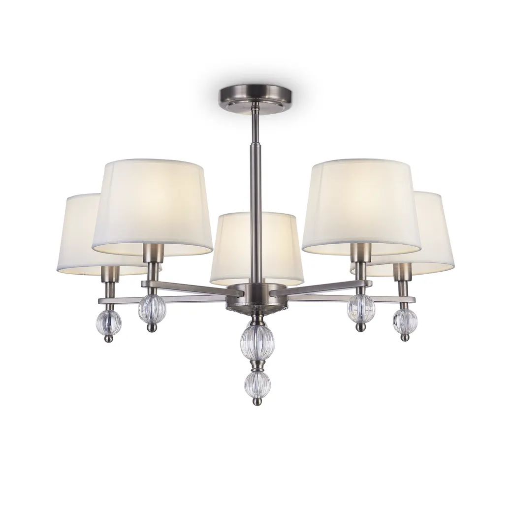 Серия светильников для интерьеров гостиных, спален и офисов в современном стиле. Арматура из метала цвета “никель” дополнена декоративными элементами из прозрачного акрила (шарики). Белые абажуры из текстиля на ПВХ.