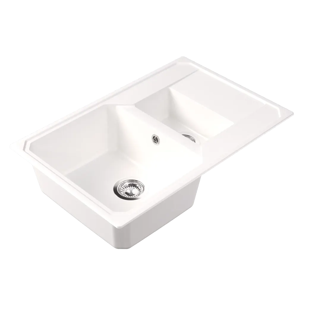 Кухонный блок, мм – 600 Габариты мойки, мм – 760х500х197 Глубина чаши, мм – 180/120 Материал – литьевой мрамор Тип установки – на столешницу (врезная) Реверсивность – да Дополнительные отверстия под аксессуары – да Гарантия – 2 года