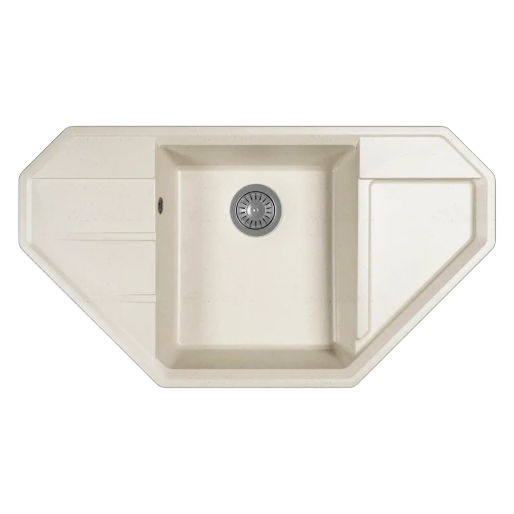 Угловой блок, мм – 900х900 Габариты мойки, мм – 910х500х197 Глубина чаши, мм – 180 Материал – литьевой мрамор Тип установки – на столешницу (врезная) Реверсивность – нет Дополнительные отверстия под аксессуары – да Гарантия – 2 года
