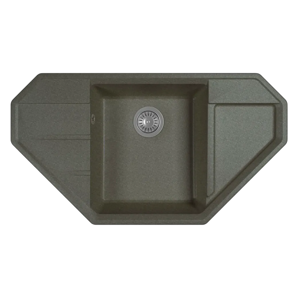 Угловой блок, мм – 900х900 Габариты мойки, мм – 910х500х197 Глубина чаши, мм – 180 Материал – литьевой мрамор Тип установки – на столешницу (врезная) Реверсивность – нет Дополнительные отверстия под аксессуары – да Гарантия – 2 года