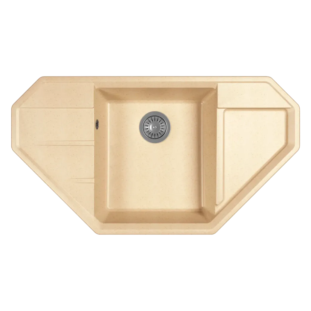 Угловой блок, мм – 900х900 Габариты мойки, мм – 910х500х197 Глубина чаши, мм – 180 Материал – литьевой мрамор Тип установки – на столешницу (врезная) Реверсивность – нет Дополнительные отверстия под аксессуары – да Гарантия – 2 года