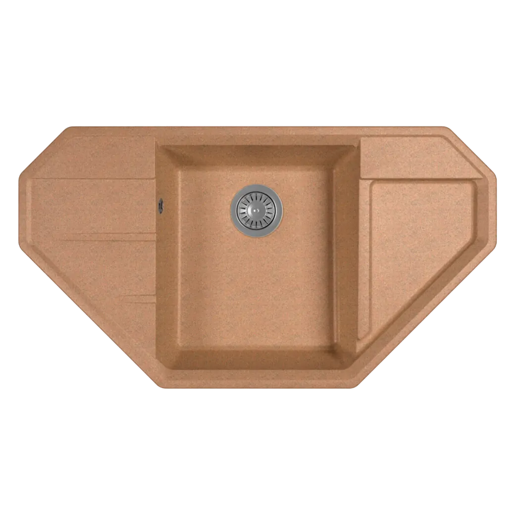 Угловой блок, мм – 900х900 Габариты мойки, мм – 910х500х197 Глубина чаши, мм – 180 Материал – литьевой мрамор Тип установки – на столешницу (врезная) Реверсивность – нет Дополнительные отверстия под аксессуары – да Гарантия – 2 года