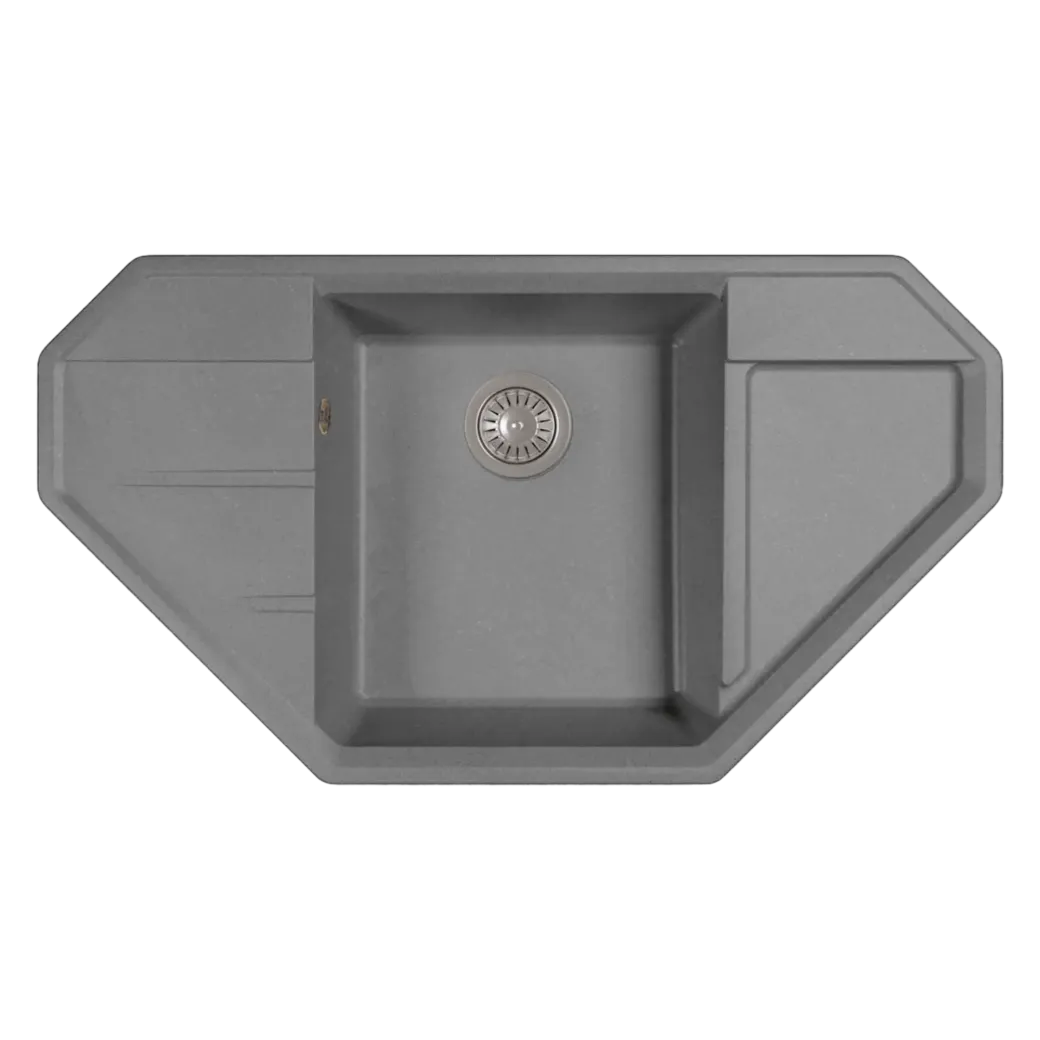 Угловой блок, мм – 900х900 Габариты мойки, мм – 910х500х197 Глубина чаши, мм – 180 Материал – литьевой мрамор Тип установки – на столешницу (врезная) Реверсивность – нет Дополнительные отверстия под аксессуары – да Гарантия – 2 года