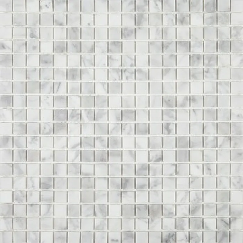 - Белая мозаика на сетке: Удобство монтажа и возможность создания сложных узоров без труда.