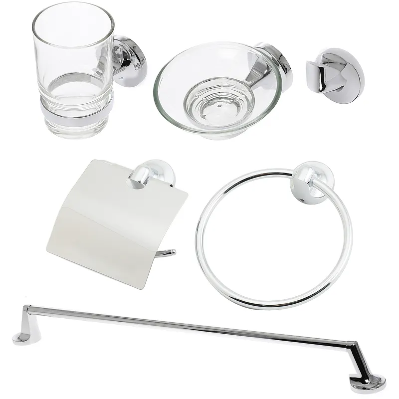 Набор аксессуаров для ванной Orange Y01-888cr из 6-ти предметов.Характеристики: Материал: цинк, стекло. Цвет: хром Монтаж: на стену. В комплекте поставки: Кольцо для полотенец. Полотенцедержатель. Держатель туалетной бумаги с крышкой. Крючок. Мыльница. Стакан для зубных щеток. Набор креплений.