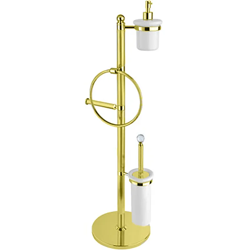 Напольная стойка с держателем туалетной бумаги, щёткой для унитаза, полотенцедержателем и держателем дозатора для жидкого мыла Cezares Olimp OLIMP-WBD-03/24-Sw.Напольная стойка Cezares из коллекции Olimp стойко выдержит постоянное воздействие влаги, подчеркнув общий вид санузла.Характеристики: Цвет: золото 24 карат. Цвет аксессуаров: белый. Материал: латунь, керамика. Ручка: Swarovski. Монтаж: напольный. Габариты (ШхВхД): 31.5x92.5x31.5 см. В комплекте поставки: Напольная стойка. Держатель туалетной бумаги. Щетка для унитаза. Держатель мыльницы. Держатель дозатора для жидкого мыла.