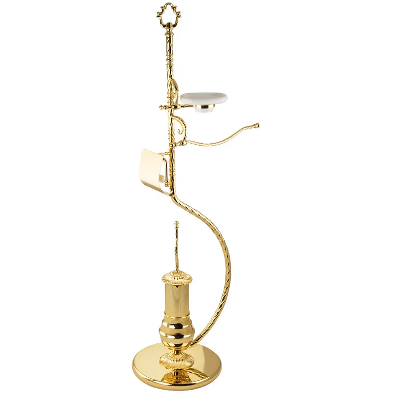 Напольная стойка Migliore Edera 16955.Характеристики: Цвет: золото. Поверхность: глянцевая. Материал: латунь, керамика. Четырехфункциональная: держатель туалетной бумаги, ершик для унитаза, мыльница, полотенцедержатель. Тип установки: напольный. В комплекте поставки: Напольная стойка.
