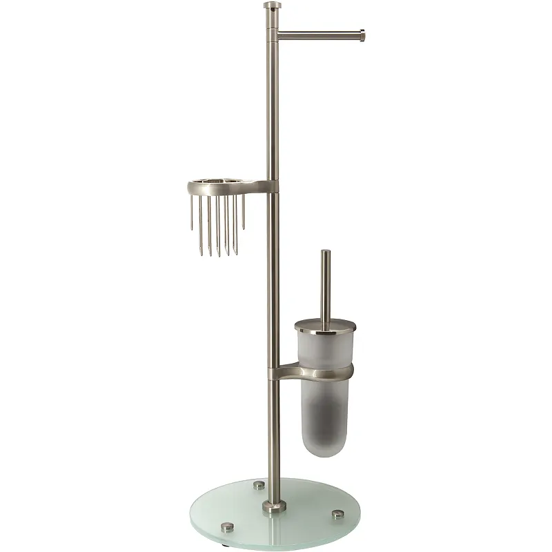Напольная стойка WasserKRAFT Ammer K-1236.Характеристики: Цвет: хром матовый. Материал: металл, матовое стекло. Покрытие: никель. Форма: круглая. Уплотнительные пластиковые кольца. Закаленное матовое стекло. Особенности: В комплект входят два держателя туалетной бумаги: с крышкой и без крышки, при монтаже можете выбрать необходимый. Простой и быстрый монтаж: крепление всех частей изделия осуществляется с помощью встроенных винтов и внутренней резьбы. Пластиковые уплотнители необходимы для бесшумного и плотного соединения металла. Закаленное стекло прочнее обыкновенного в 5-10 раз, разбиваясь, оно не образует острых осколков, а разрушается на фрагменты с тупыми краями, которые не столь опасны для человека. Каждое изделие в комплекте можно повернуть на 360 градусов в любую сторону, Вы можете поменять их местами или совсем убрать. Съемная колба крепится на металлическом держателе, между держателем и колбой установлена уплотнительная прокладка. Ножки регулируются по высоте до 2 см, имеют пластиковое основание, что позволит избежать появление царапин на полу. В комплекте поставки: Держатель туалетной бумаги (в комплекте с крышкой и без крышки). Держатель освежителя воздуха. Ершик для унитаза. Набор для монтажа.