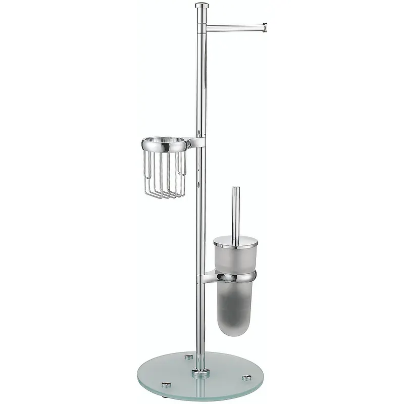 Напольная стойка WasserKRAFT K-1256.Характеристики: Покрытие: хромоникелевое. Материал: металл, закаленное матовое стекло. Уплотнительные пластиковые кольца. Простой и быстрый монтаж за 10 минут. Безопасное матовое закаленное стекло 10 мм с закругленными углами. Удобное размещение изделий. Съемные колбы. Регулируемые по высоте ножки. В комплекте поставки: Держатель туалетной бумаги. Держатель освежителя воздуха. Ершик для унитаза. Стойка. Набор для монтажа.