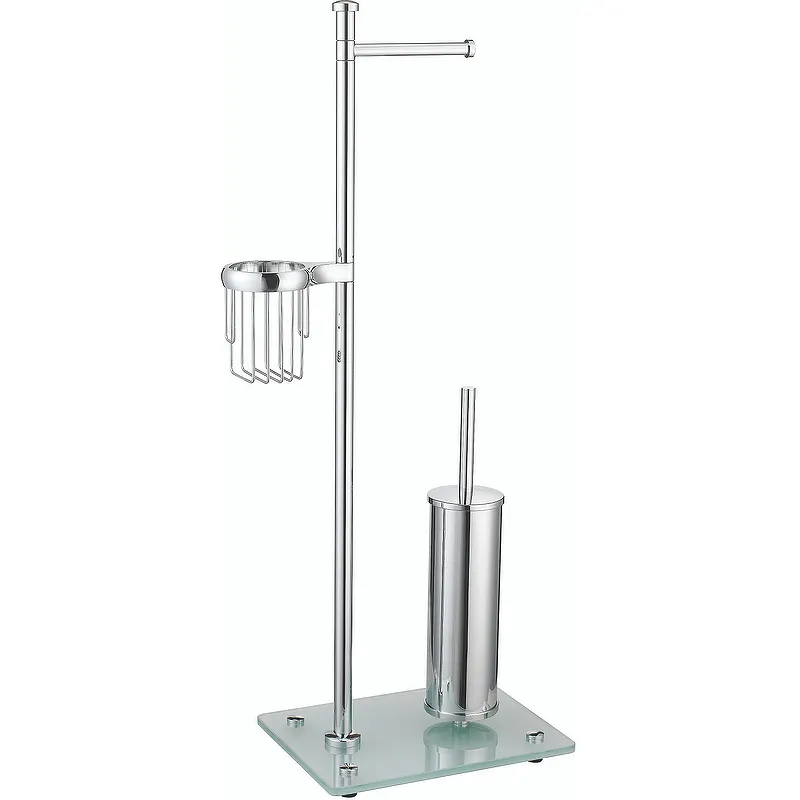 Напольная стойка WasserKRAFT K-1264.Характеристики: Покрытие: хромоникелевое. Материал: металл. Уплотнительные пластиковые кольца. Простой и быстрый монтаж за 10 минут. Безопасное матовое закаленное стекло 10 мм с закругленными углами. Удобное размещение изделий. Съемные колбы. Регулируемые по высоте ножки. В комплекте поставки: Держатель туалетной бумаги. Держатель освежителя воздуха. Ершик для унитаза. Стойка. Набор для монтажа.