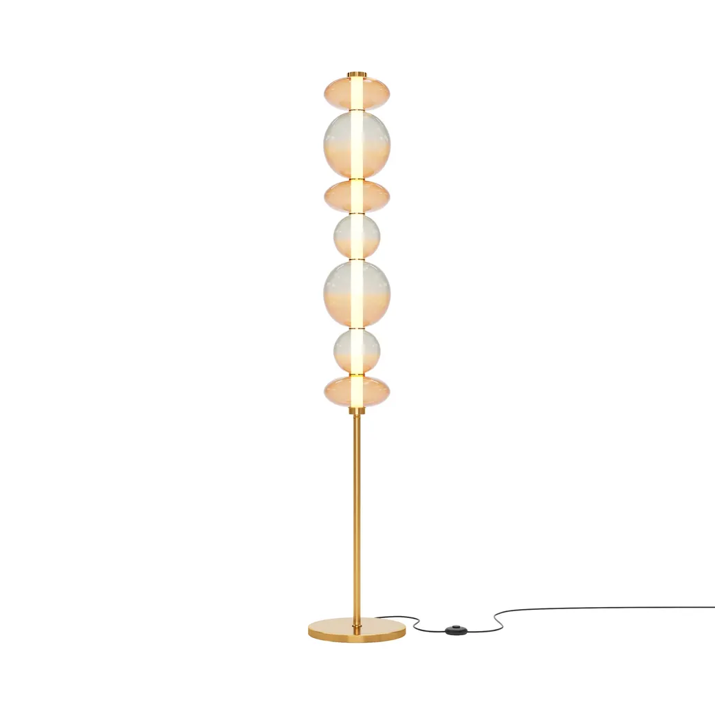 Светильники с тонированными выдувными стеклянными плафонами (дымчатыми или янтарными) и металлической арматурой (черной или цвета латуни). Окрашивание плафонов градиентное. Источник света: LED. Световой элемент установлен внутри акрилового рассеивателя. Цветовая температура источника света – 3000К, угол рассеивания — 120°. Торшеры снабжены Push-кнопкой на проводе.
