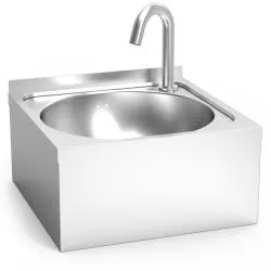 Настенная раковина выполнена из нержавеющей стали AISI 304, в комплекте имеются сенсор для включения воды, кран с таймером работы (15 сек.), сливной клапан.
