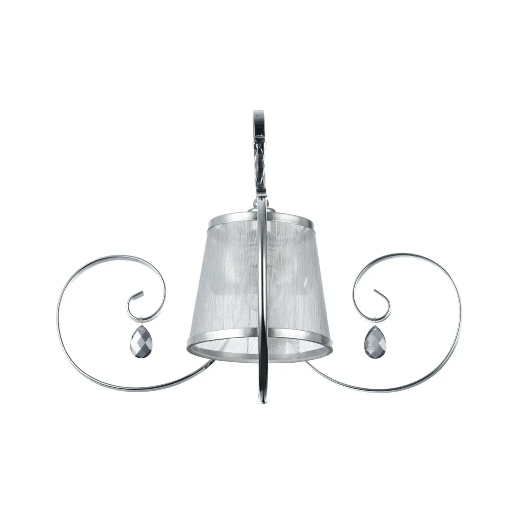 Абажуры и арматура светильников выполнены в разных цветах, с несколькими видами арматуры. Основание люстры украшено стеклянным декоративным элементом, а завитки рожков украшают подвески.