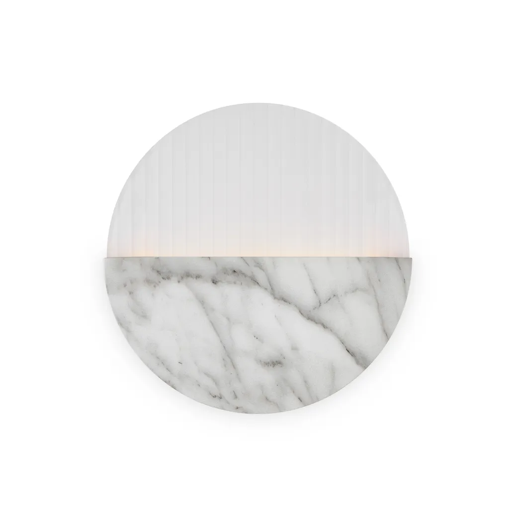 Матовая металлическая арматура, оттенки – латунь, мрамор. Рассеиватель двух видов: рифленое стекло и белый матовый акрил. Источник света - светодиодная лента, температура 3000К.