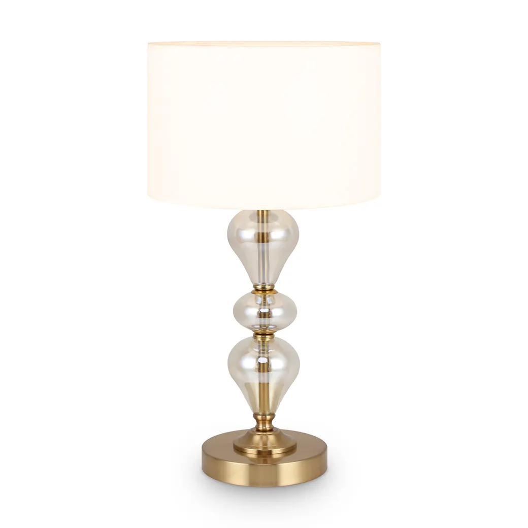Арматура из металла, цвет — латунь. Плафоны — тканевые, молочного цвета. Металлическая конструкция декорирована выдувными стеклянными элементами с перламутровым напылением. Источником света служит лампа с цоколем Е14.