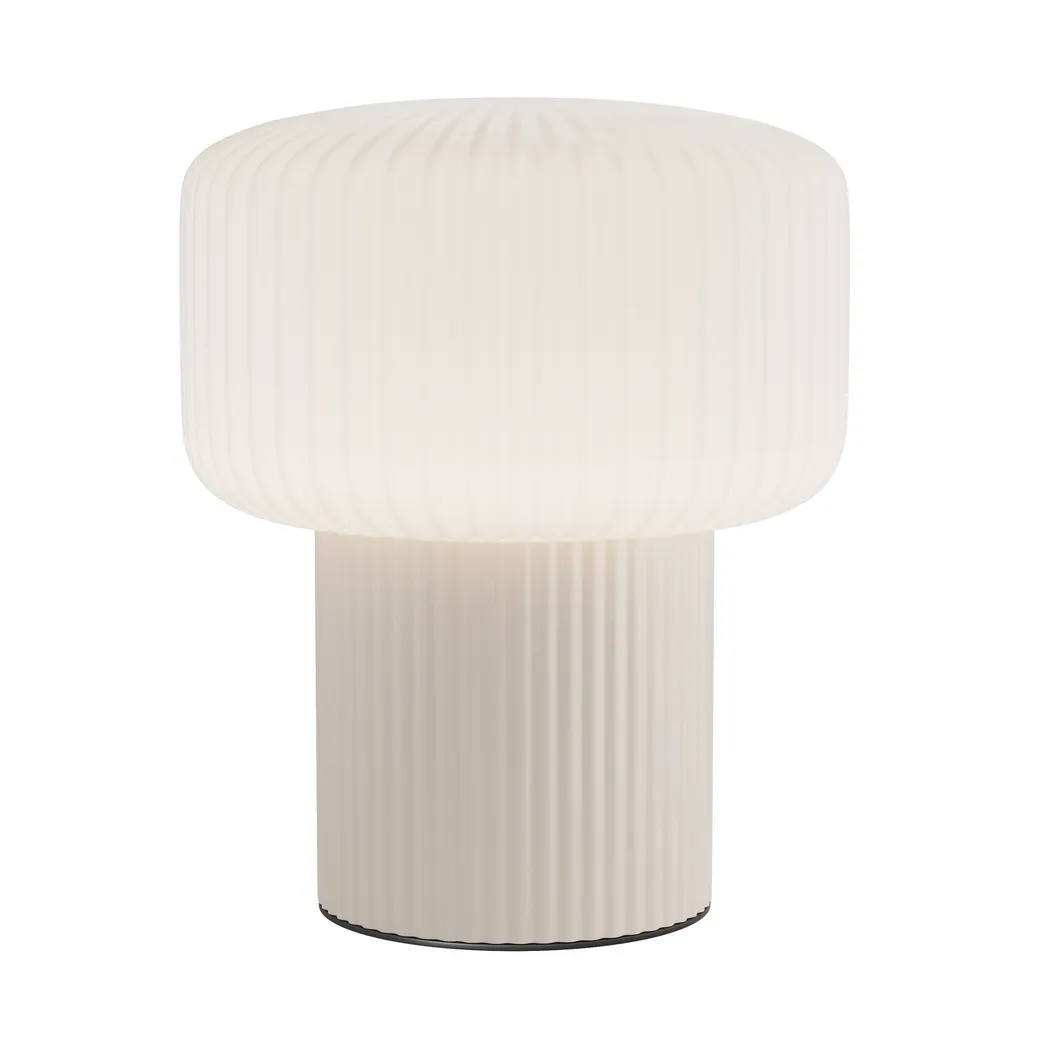 В дизайне серии объединены тренды на рельефность и форму "грибочка". Основание украшено вертикальным рельефом. Сочетание текстур белого стеклянного плафона и керамического основания. В серии два пастельных оттенка: кремово-белый (RAL 9001) или серебристо-серый (RAL 7001). Цоколь сменного источника настольных ламп — G9. LED-источник у портативного светильника. Трендовые дизайн и цветовая палитра делают идеальным дополнением для любого пространства — гостиная, рабочий стол или прикроватная тумбочка.