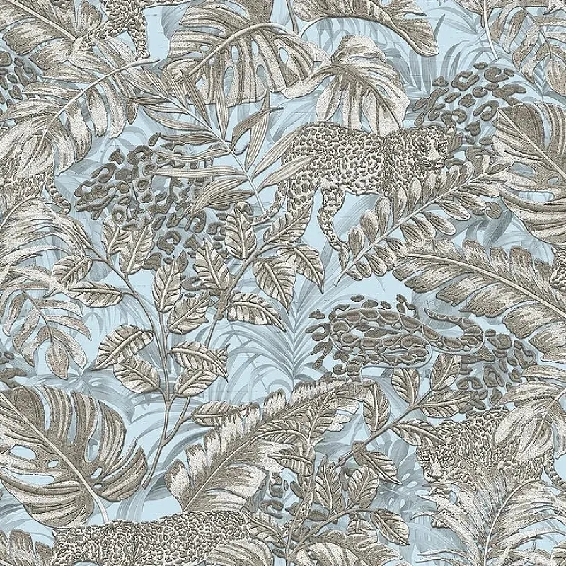 - Эстетичная отделка обоев: Голубой/Бежевый цвет и рисунок листьев придают интерьеру изысканность и уют.