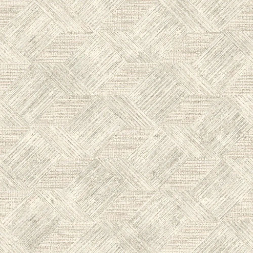 Обои Aura Evergreen арт-7357 представляют собой виниловые рулонные покрытия на флизелине, произведенные в Канаде. Они обладают современным геометрическим узором в виде ромбов и светлым бежевым цветом, что делает их подходящими для различных интерьеров, включая коридоры и прихожие.