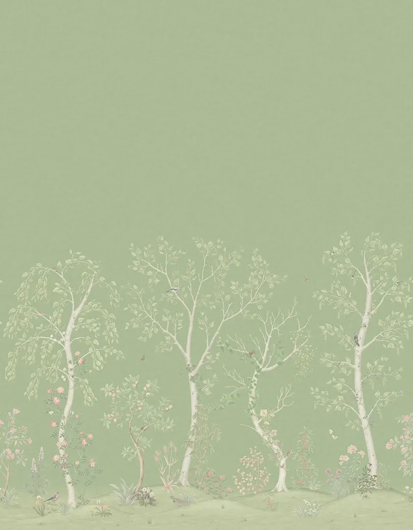 Обои Cole & Son арт-120-6021S из коллекции The Gardens представляют собой текстильные обои с рисунком в стиле шинуазри. Они созданы для оформления спальни и гостиных, обеспечивая утончённый и природный вид благодаря использованию зелёных оттенков.