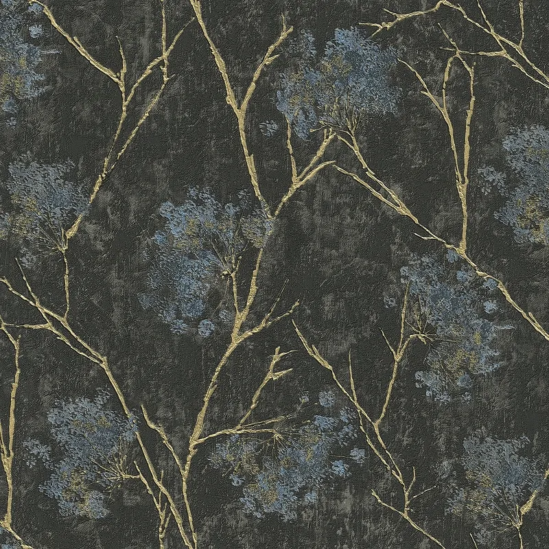 Обои Emiliana Parati Damasco Reale 73418 Винил на флизелине (1,06*10,05) Черный/Голубой/Золото, Листья/Цветы