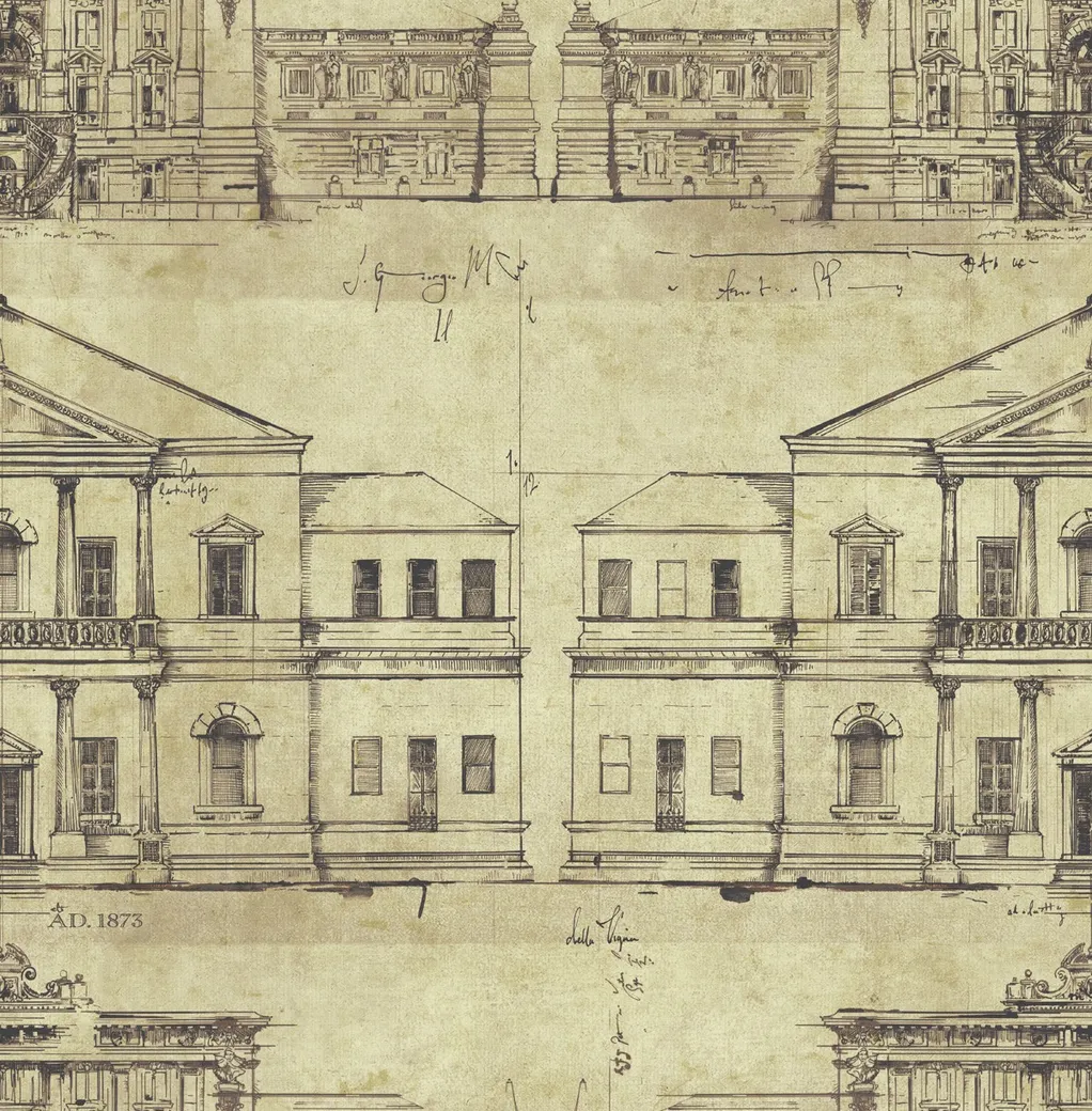 Обои SV61607 от компании KT-Exclusive из коллекции Savannah House представляют собой рулонные бумажные обои с рисунком архитектурных элементов. Их универсальный бежевый цвет делает их подходящими для различных стилей интерьера, особенно в кабинетах.