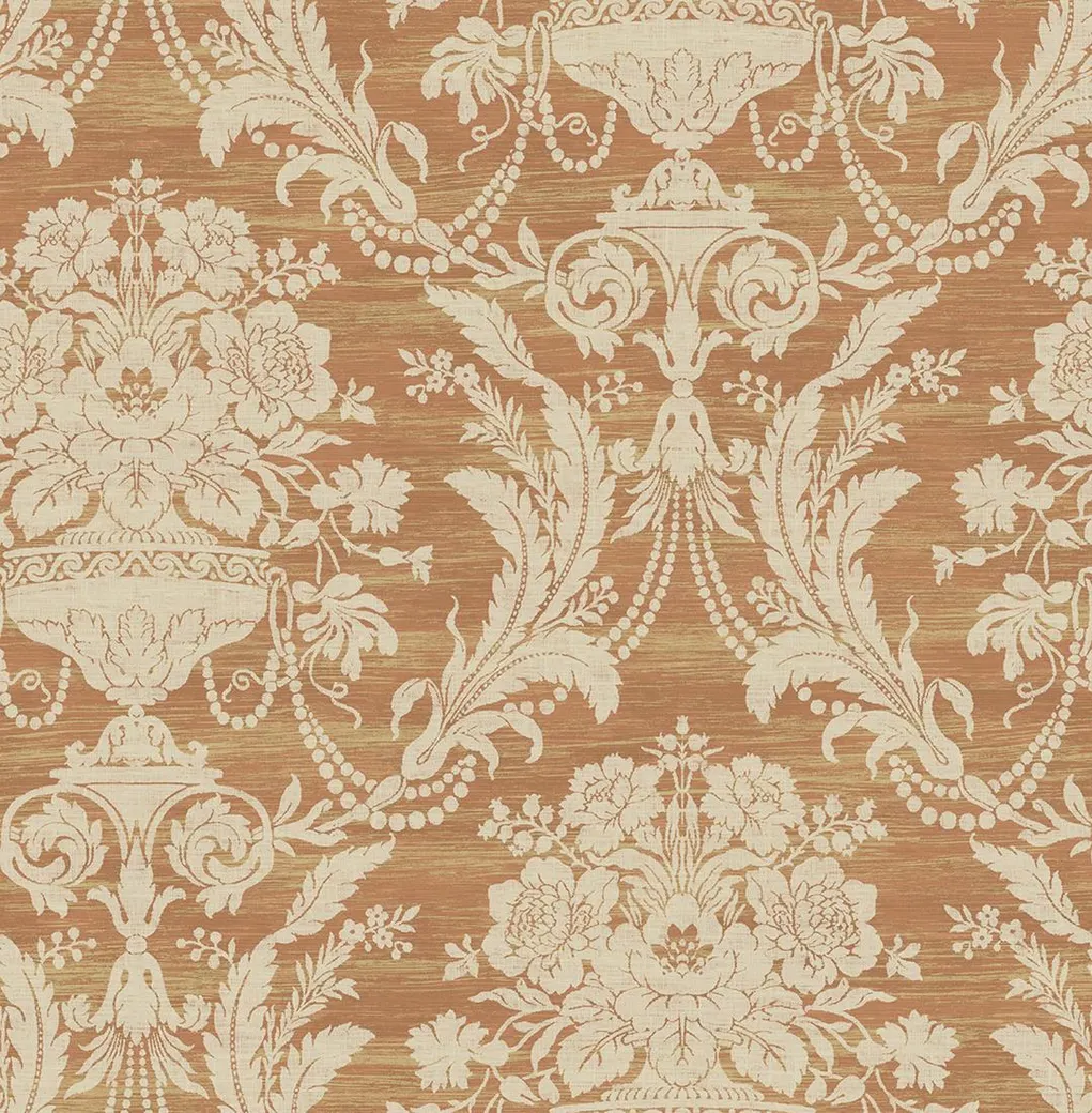 Обои DV51101 от американского производителя KT-Exclusive являются частью коллекции Villa D'este. Эти бумажные обои имеют яркий оранжевый и коричневый цвет, что позволяет им гармонично вписываться в интерьеры в классическом стиле.