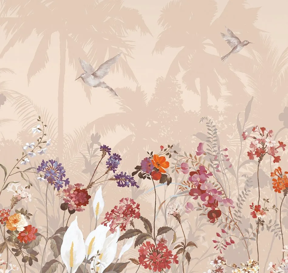 - Рисунок: Цветы, птицы, растения, ветки, листья