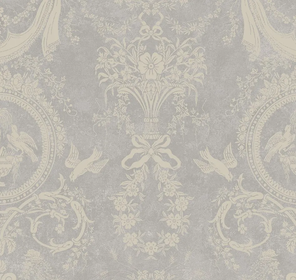 Обои Loymina Tondo арт-Td6-022 — это флизелиновые рулонные обои, произведенные в России. Они имеют серый фон с рисунками вазонов и медальонов, что делает их подходящими для классического интерьера.