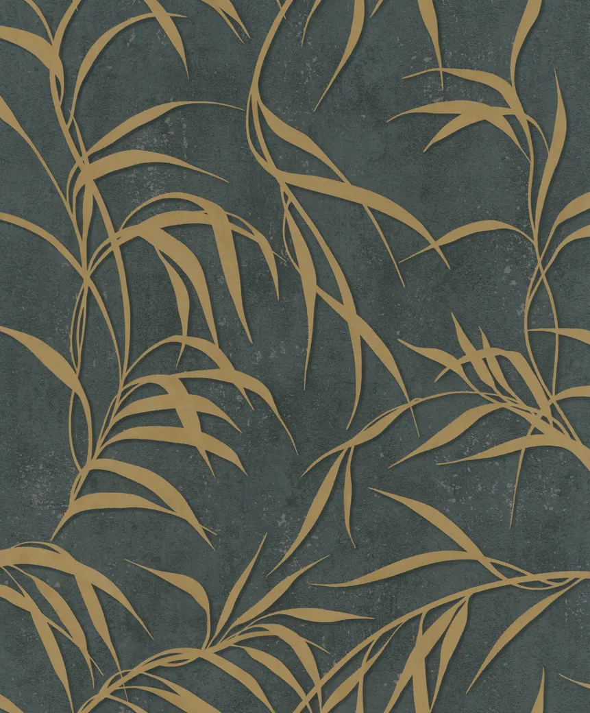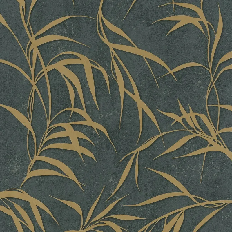 - Виниловые обои на флизелине размером 1,06 м x 10,05 м в цветах черный и золото с рисунком листьев и штукатурки.