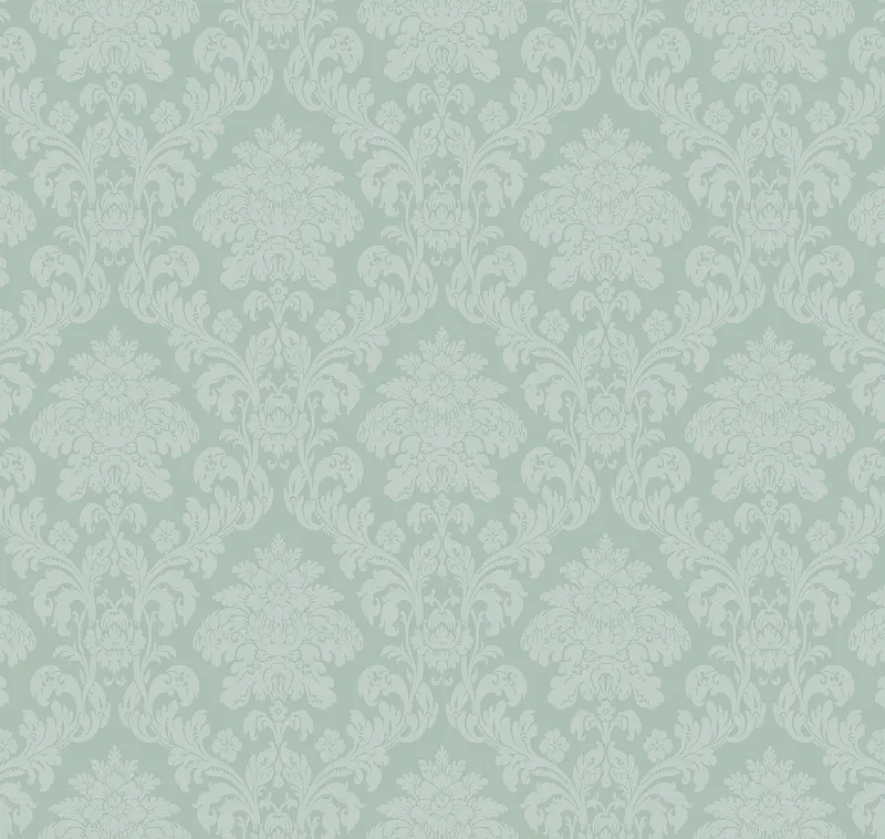 - Флизелиновые обои размером 1 м x 10.05 м, зеленого цвета с дамасским рисунком.
