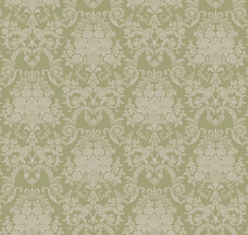 - Флизелиновые обои размером 1 м на 10,05 м с рисунком "Дамаск" в зелёном цвете.