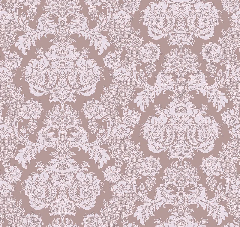 - Флизелиновые обои размером 1 м x 10,05 м в розово-серой цветовой гамме с дамаск рисунком.
