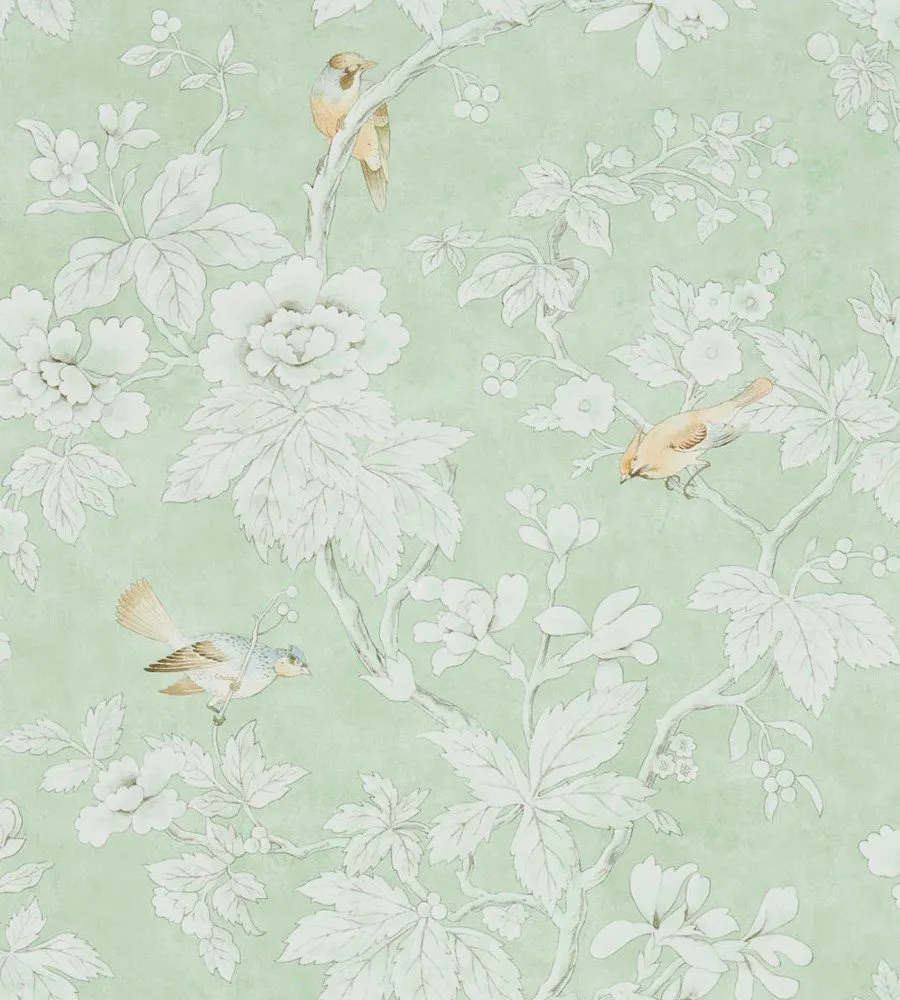 Обои Sanderson Chiswick Grove арт-216387 представляют собой флизелиновые рулонные обои с изображением птиц и растений. Они имеют успокаивающий зеленый цвет, что делает их подходящими для различных помещений, таких как гостиная и спальня.