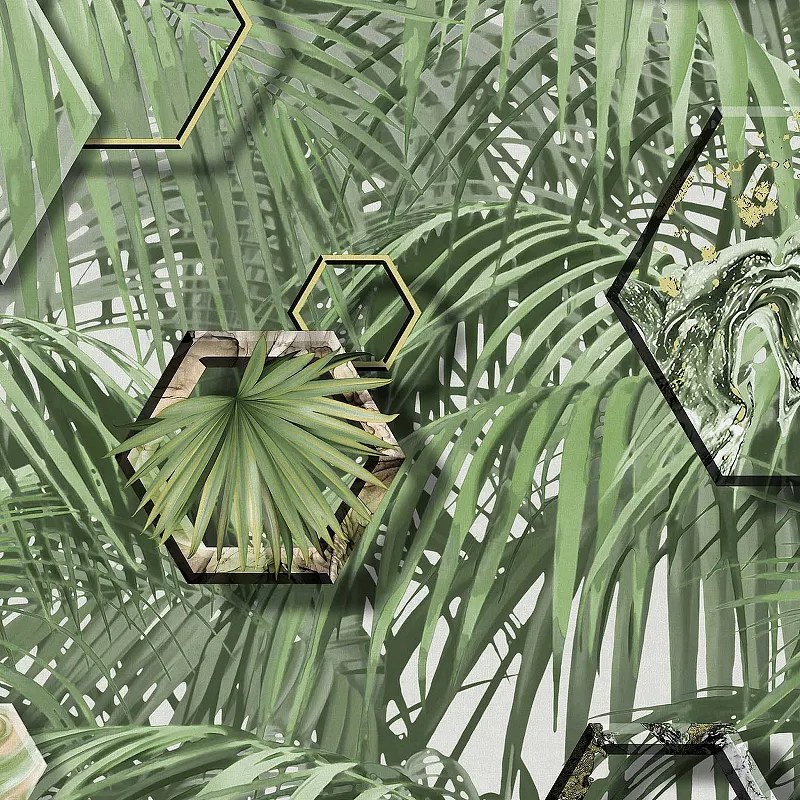 - Эстетичное оформление стен: Рисунок с листьями и геометрией добавляет интерьеру динамичности и современности.