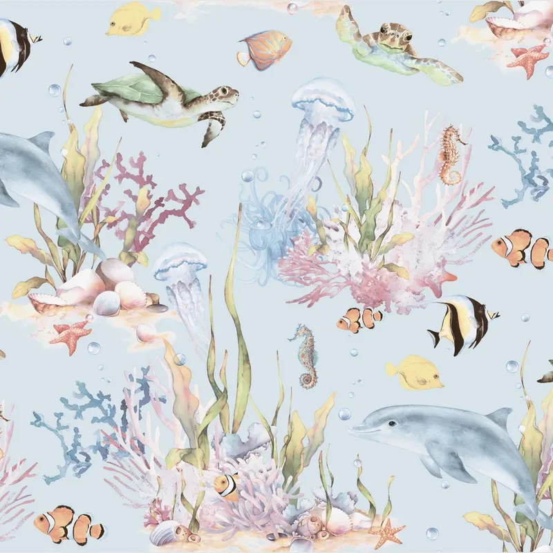 Обои Wall Up арт-654226 из коллекции DreamLand представляют собой виниловые рулонные обои с морской тематикой. Они выполнены в голубом и разноцветном цветах, что делает их подходящими для оформления детских комнат.