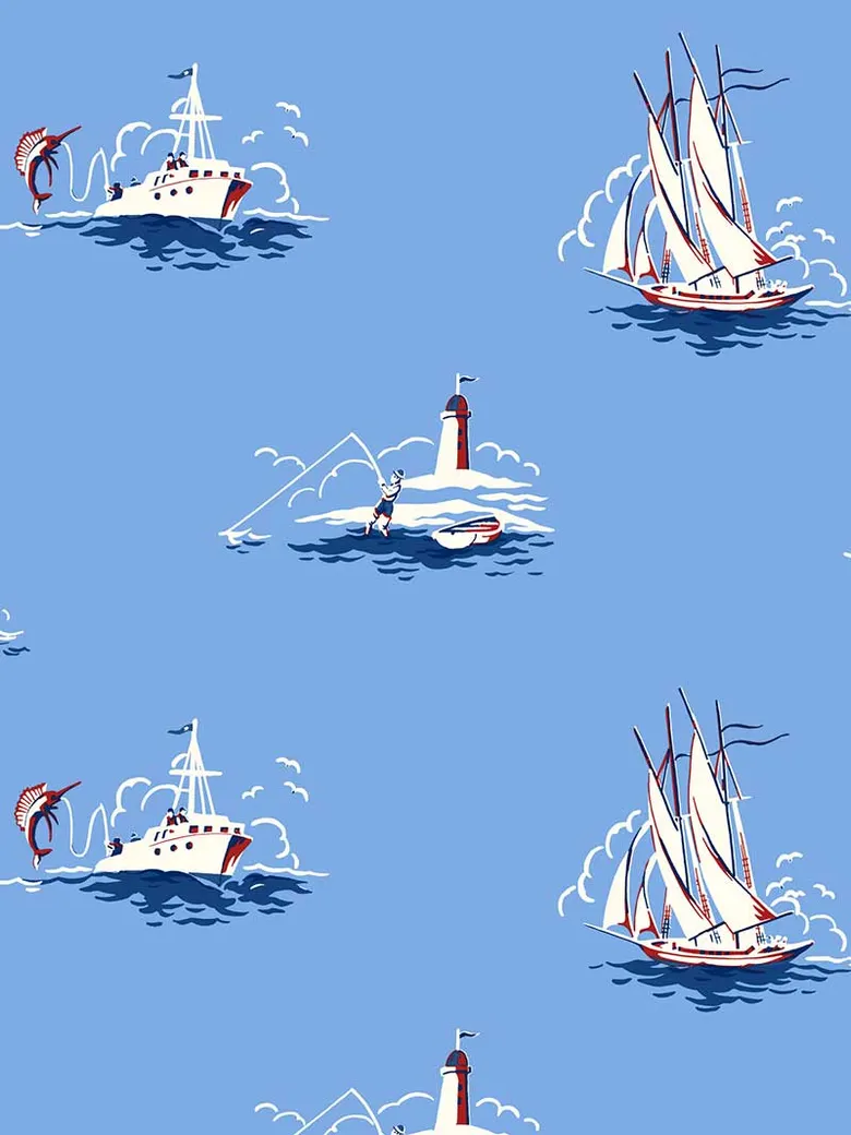 Обои KJ53302 от Wallquest из коллекции Pajama Party предназначены для детских комнат. Они выполнены в голубом цвете и имеют морскую тематику, что делает их подходящими для оформления пространства для мальчиков.