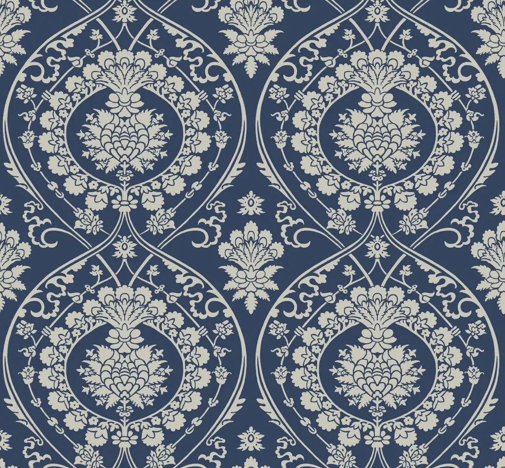 Обои DM4901 от компании York представляют собой классический элемент декора, идеально подходящий для создания роскошного интерьера. Синий цвет и медальонный рисунок добавляют глубину и элегантность, что делает их идеальными для спальни, кабинета или гостиной.