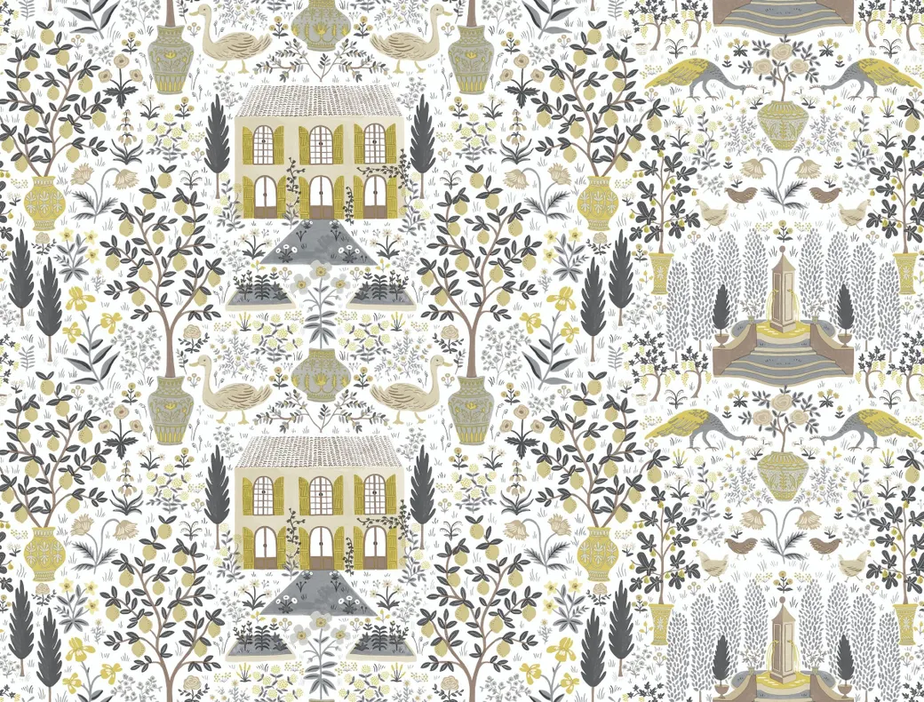 Обои RI5107 от компании York из коллекции Rifle Paper Co представляют собой флизелиновые рулонные обои с сюжетным рисунком. Они идеально подходят для оформления гостиных, кабинетов и спален. Уникальная цветовая гамма сочетает белый, желтый и серый оттенки, что способствует созданию светлого и просторного интерьера.