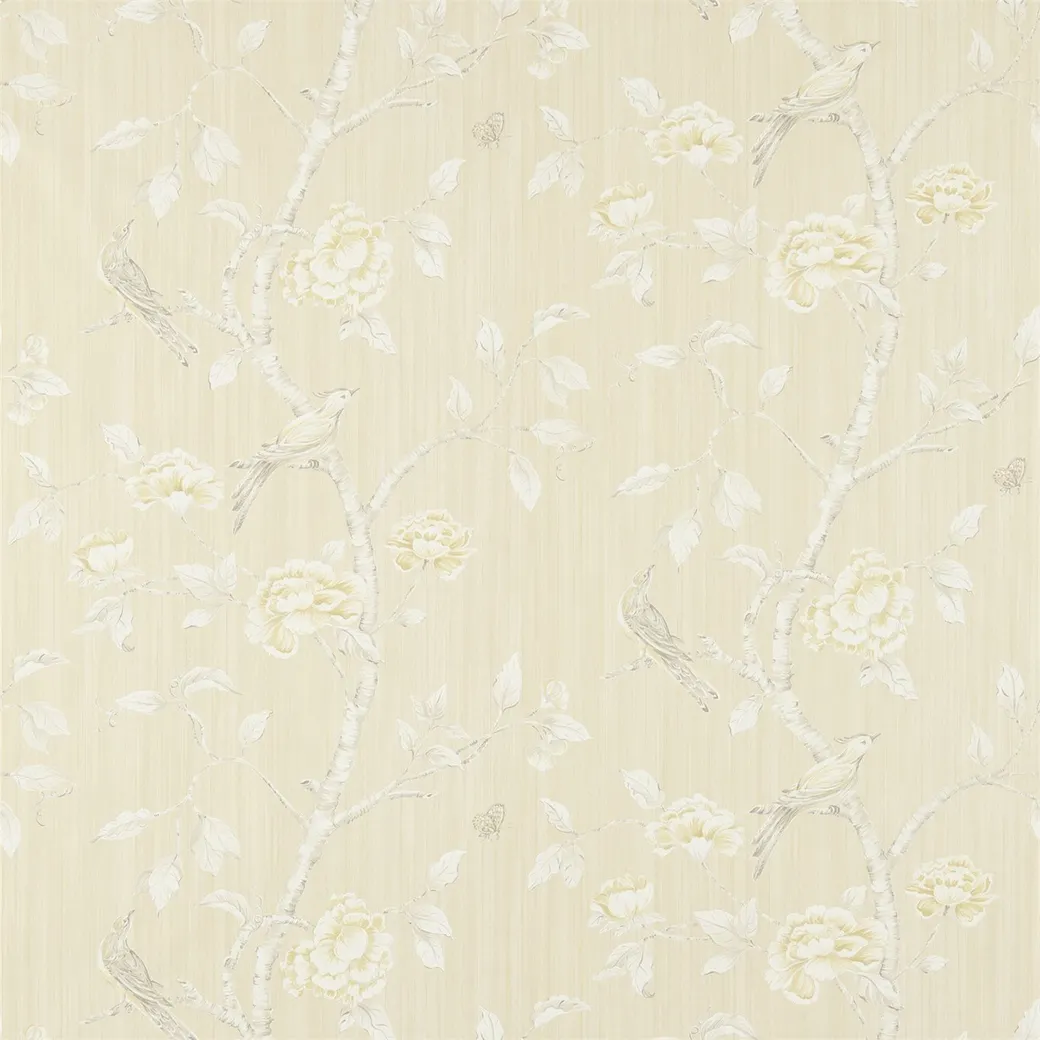 Обои Zoffany Woodville арт-ZWOO311349 представляют собой рулонные бумажные обои, выполненные в светлых желтых и бежевых тонах. Их дизайн включает изображения растений и птиц, что делает их подходящими для использования в интерьере гостиной и спальни.