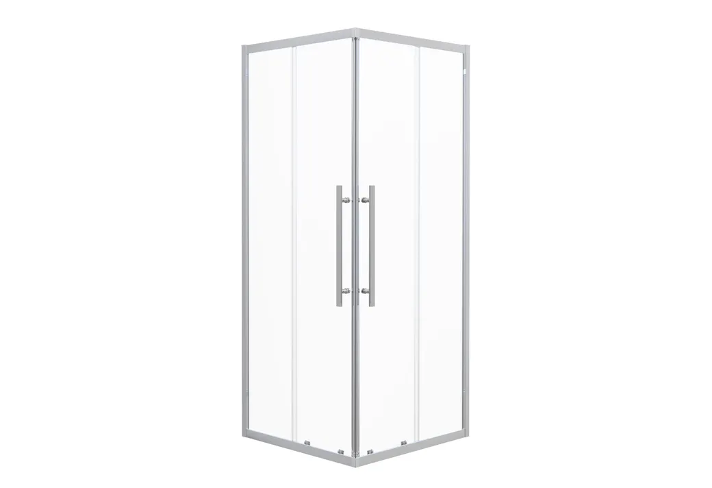 Прозрачные стекла (6 мм) с покрытием Easy Clean. Профиль алюминиевый (хром). Двойные верхние и нижние ролики. Стальные ручки (44см) в цвет профиля. РАЗМЕР: 90 х 90 х 195