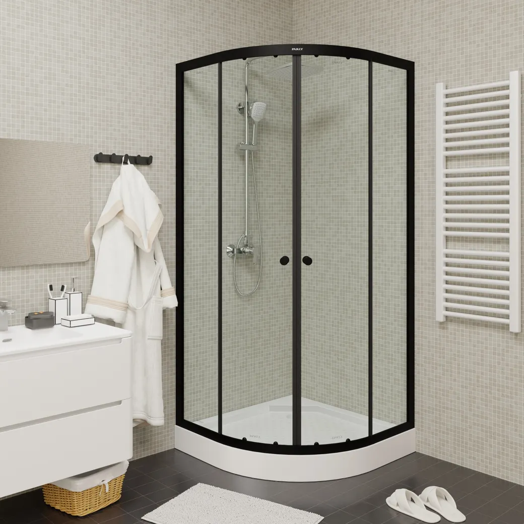 закаленное стекло 6 мм, прозрачное профиль - алюминиевый, черный, узкий (верхний шириной всего 37мм!!!, пристенный — 25мм!!!) пристенный профиль с регулировкой выдвижения для установки на неровные стены (до 10мм с каждой стороны) двойные металлические ролики металлическая ручка 19 см
