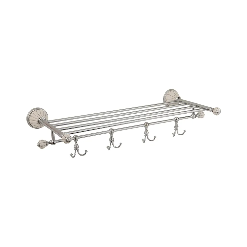 Полка-держатель для полотенец коллекции OLIVIA бренда MIGLIORE - это удобный аксессуар для ванной комнаты или сауны. На полке можно хранить свежие полотенца или прочие предметы одежды, а 4 крючка классической формы расположены на достаточном удалении друг от друга, что позволит удобно разместить любые вещи и полотенца.